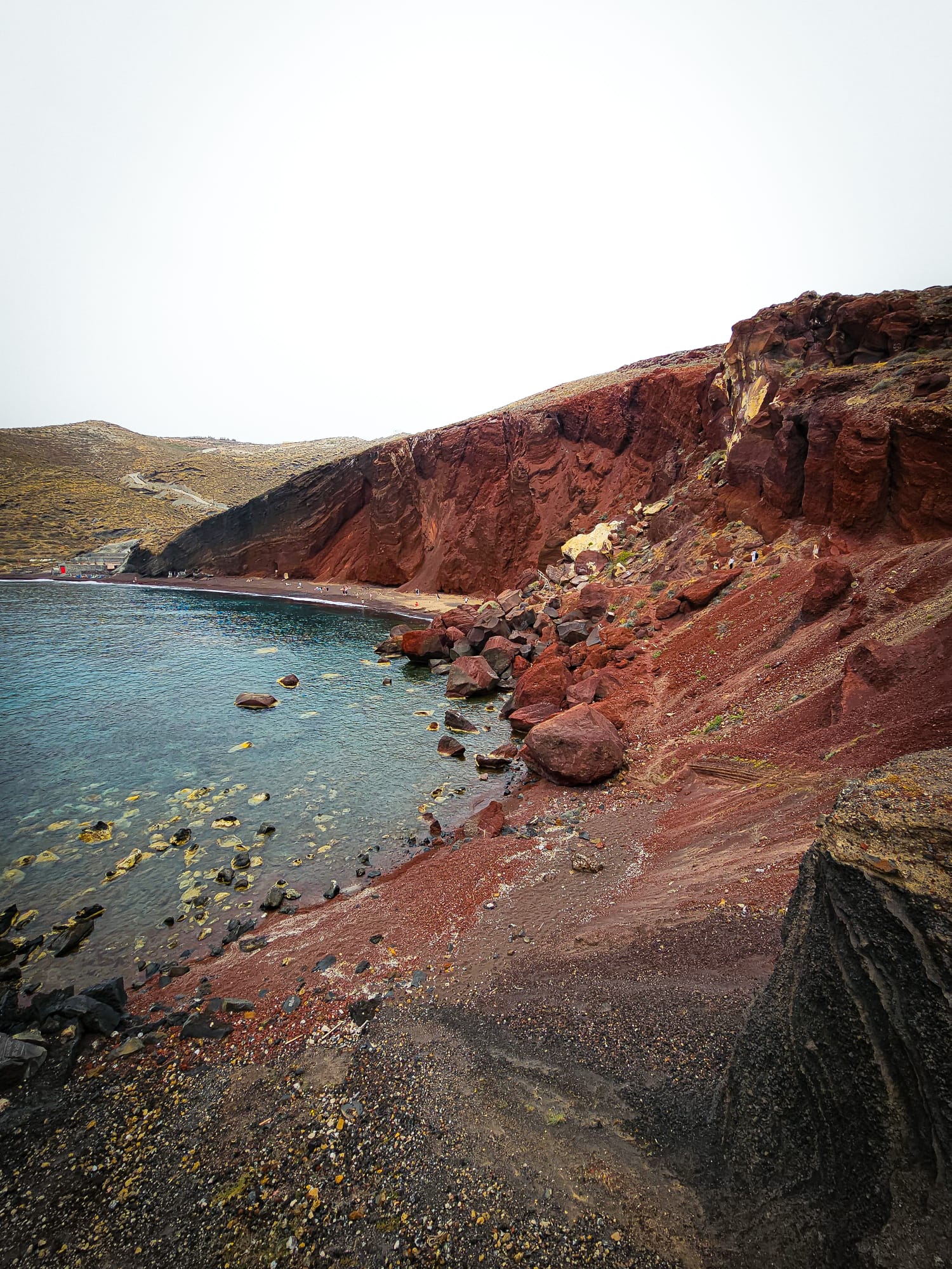La plage rouge, ou Red Beach, est une plage particulière. Comme son nom l’indique, elle est rouge. Elle vaut vraiment le détour ! Il faut prendre un petit sentier (attention aux tongs, c’est assez escarpé), et le parking est gratuit. Les falaises se sont formées avec la lave, ce qui donne cette couleur rouge orangée particulière. Ce jour-là, il faisait gris, mais c’était tout de même magnifique à voir !