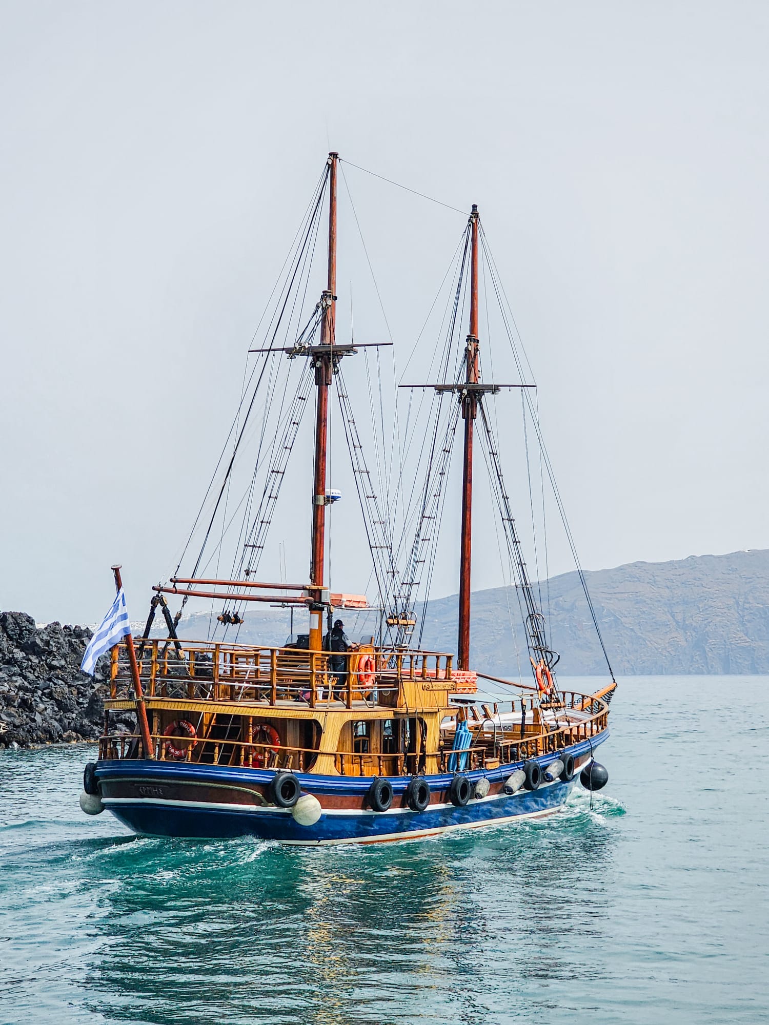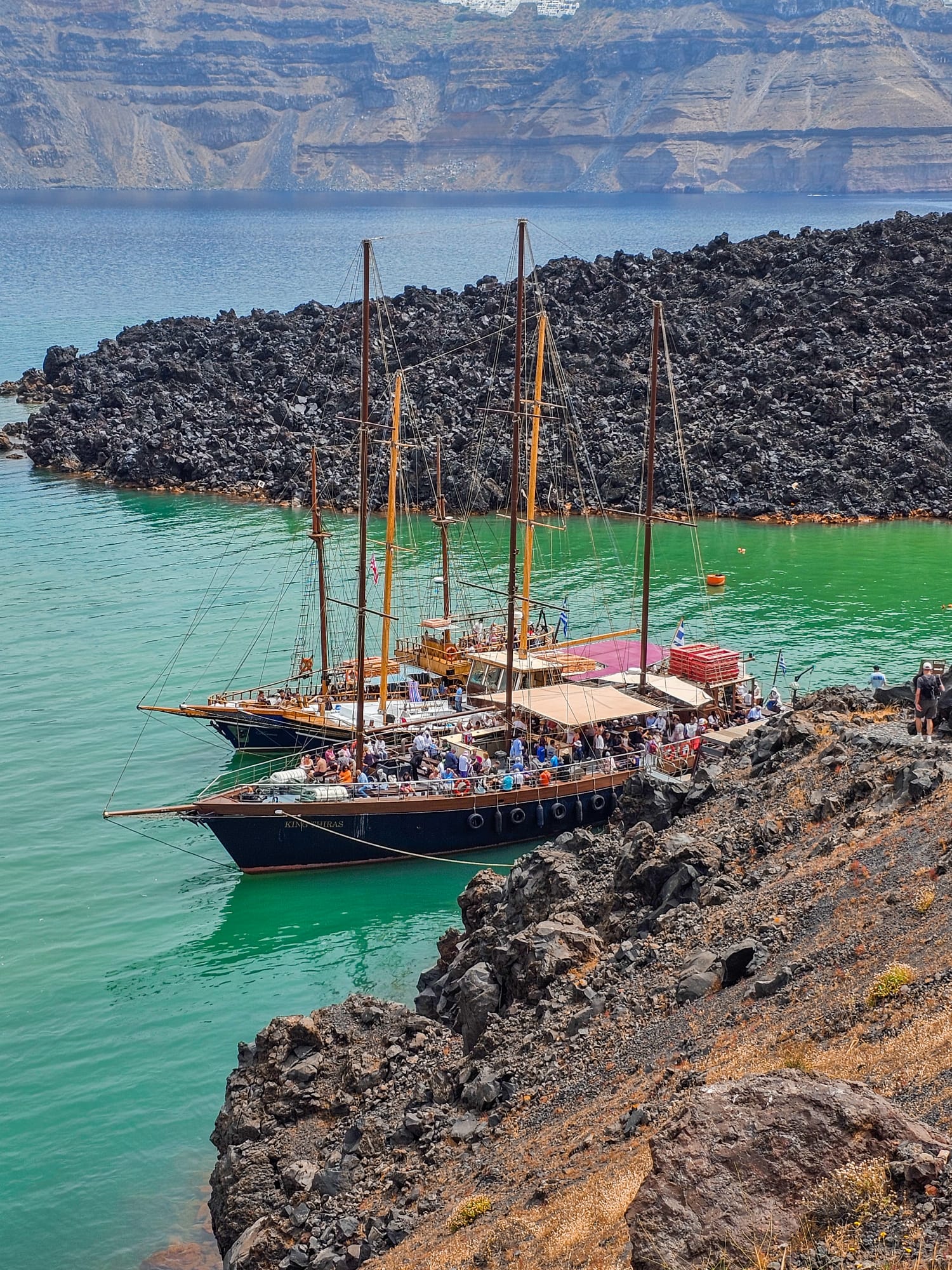 Nous avons fait une croisière pour visiter Thólos Naftílos et Thirassia, pour environ 50 euros par personne, navette comprise. Le point de rendez-vous était à Perissa, où un grand bus est venu nous récupérer. À cela, il faut rajouter 5 euros par personne pour visiter le volcan. Évitez les tongs et optez pour de bonnes chaussures car ça grimpe ! Personnellement, j’ai trouvé la visite du volcan un peu courte, à peine le temps de monter qu’il fallait déjà redescendre. Cela reste une visite assez sympathique.