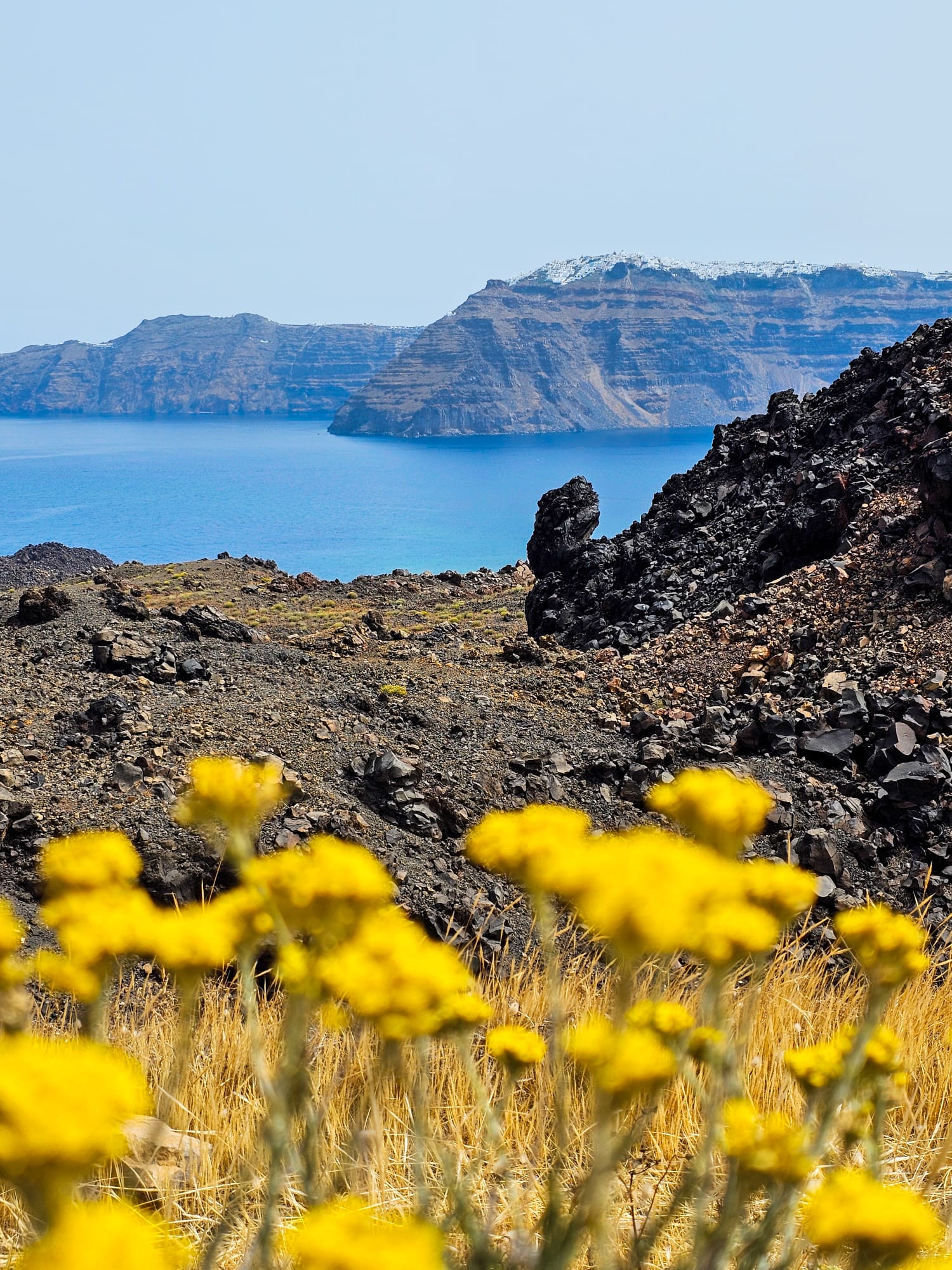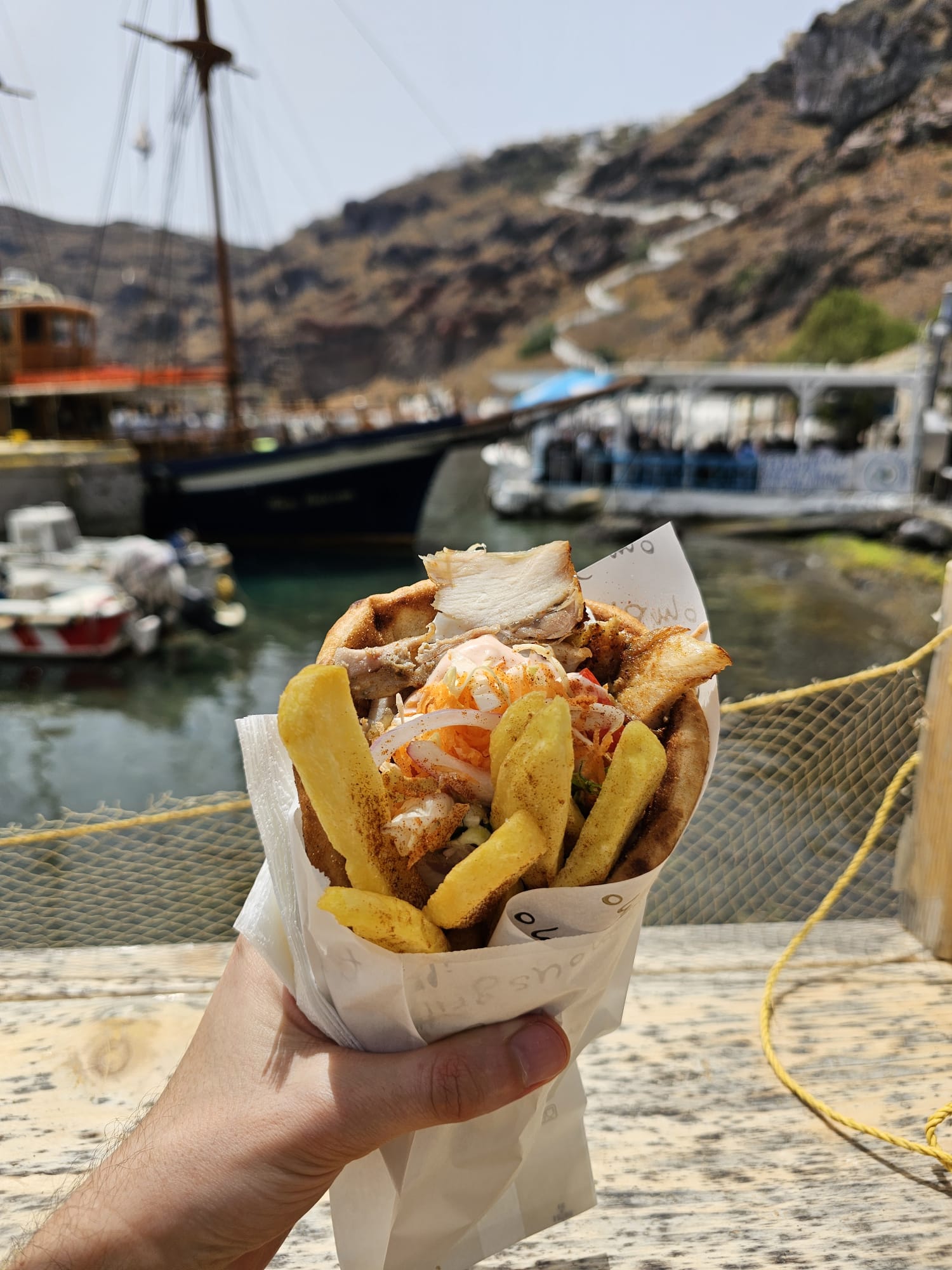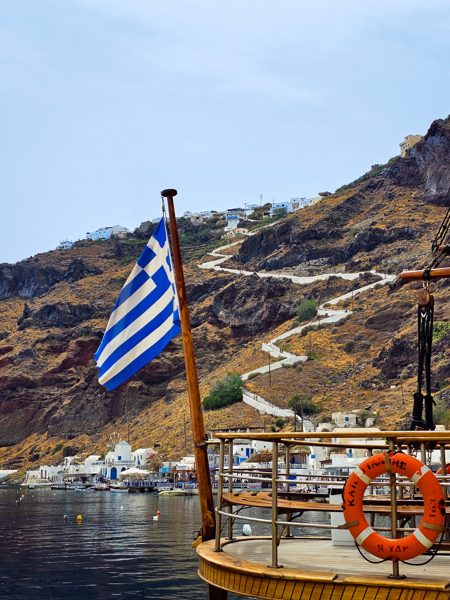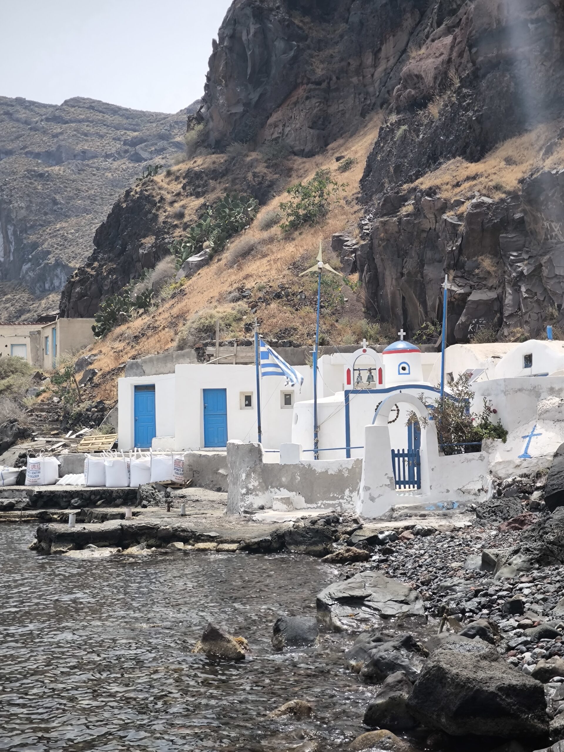 Après ces 30 minutes, le bateau a continué son périple jusqu’à Thirassia pour manger. C’est une île qui est plus calme, pour se rendre au village, il faut grimper environ 30 à 45 minutes. Souvent boudée par les touristes, vous pouvez vous y rendre en bateau-taxi pour bien moins cher. Personnellement, nous ne sommes pas montés, car le temps était encore une fois le problème ; nous n’avions que 2 heures. Un bon gyros, une ballade sur le port et encore une pause dans un joli cadre.