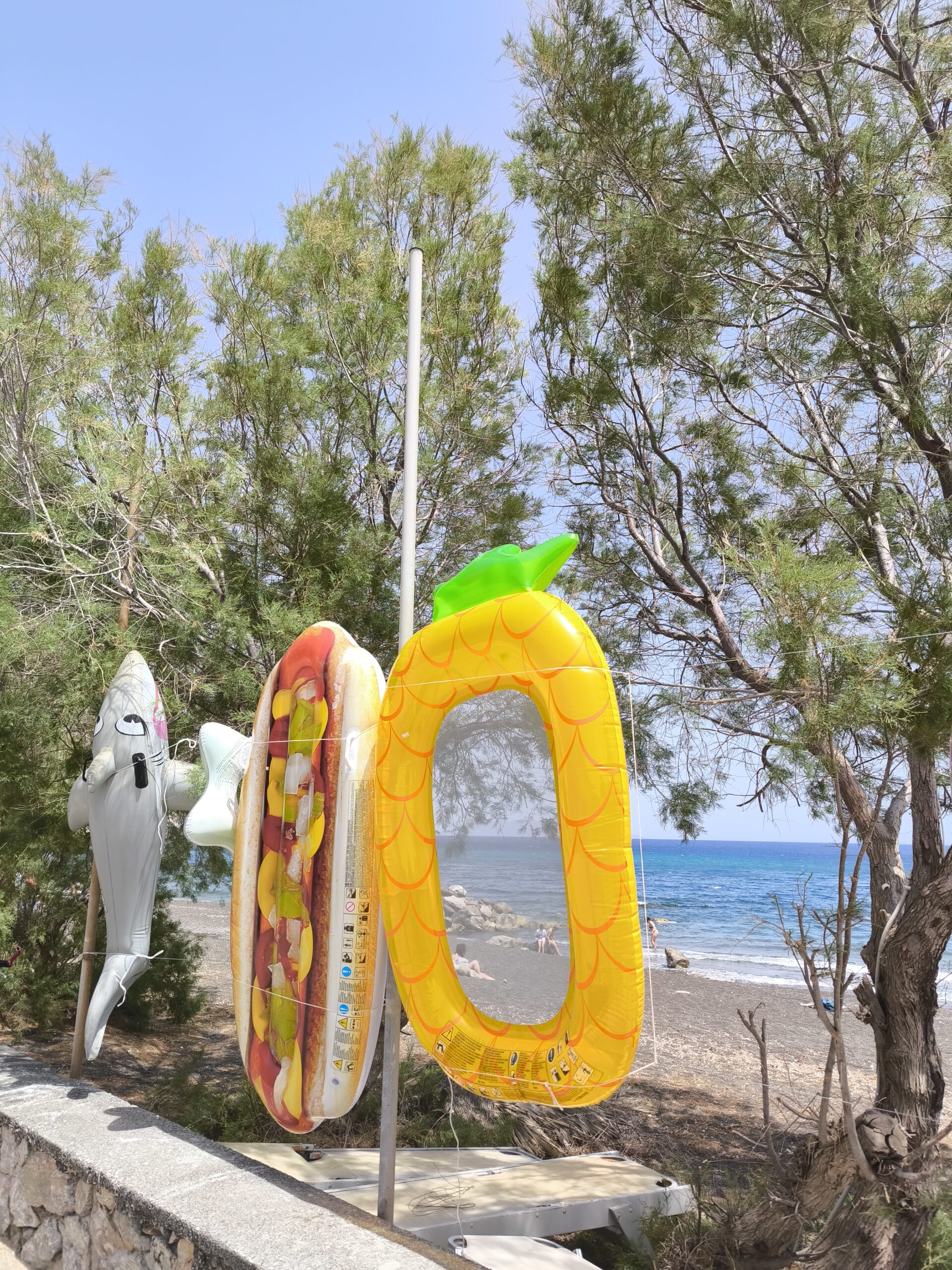 La météo est plutôt chaude en mai, j’ai emporté seulement des vêtements d’été et une tenue pour mon retour à Genève. Et j’ai bien fait ! Le soleil tape entre midi et 16 heures, nous avons même pu faire trempette à Perissa avec les poissons ! Si vous avez la possibilité de prendre un masque et un tuba, c’est l’occasion !