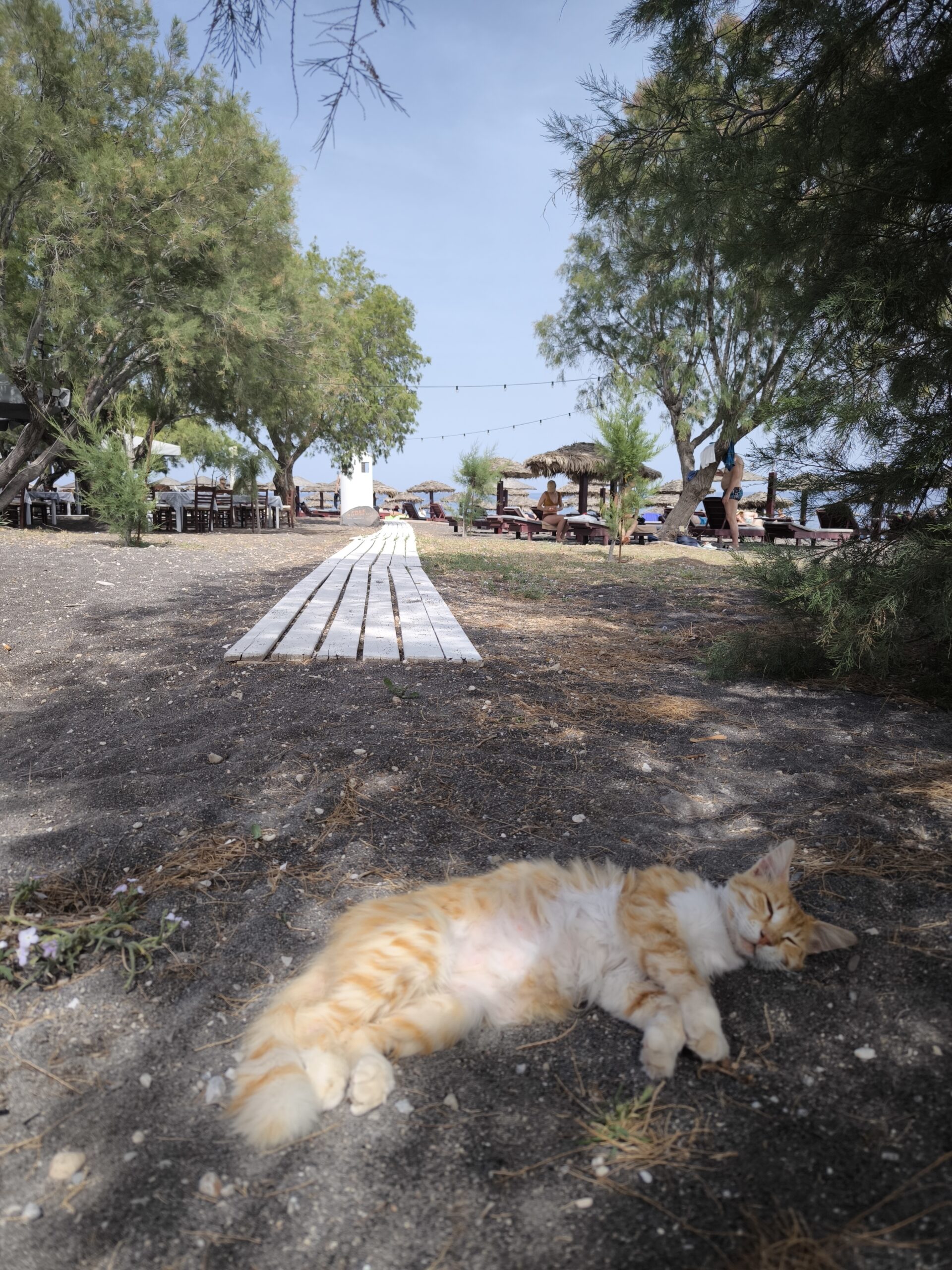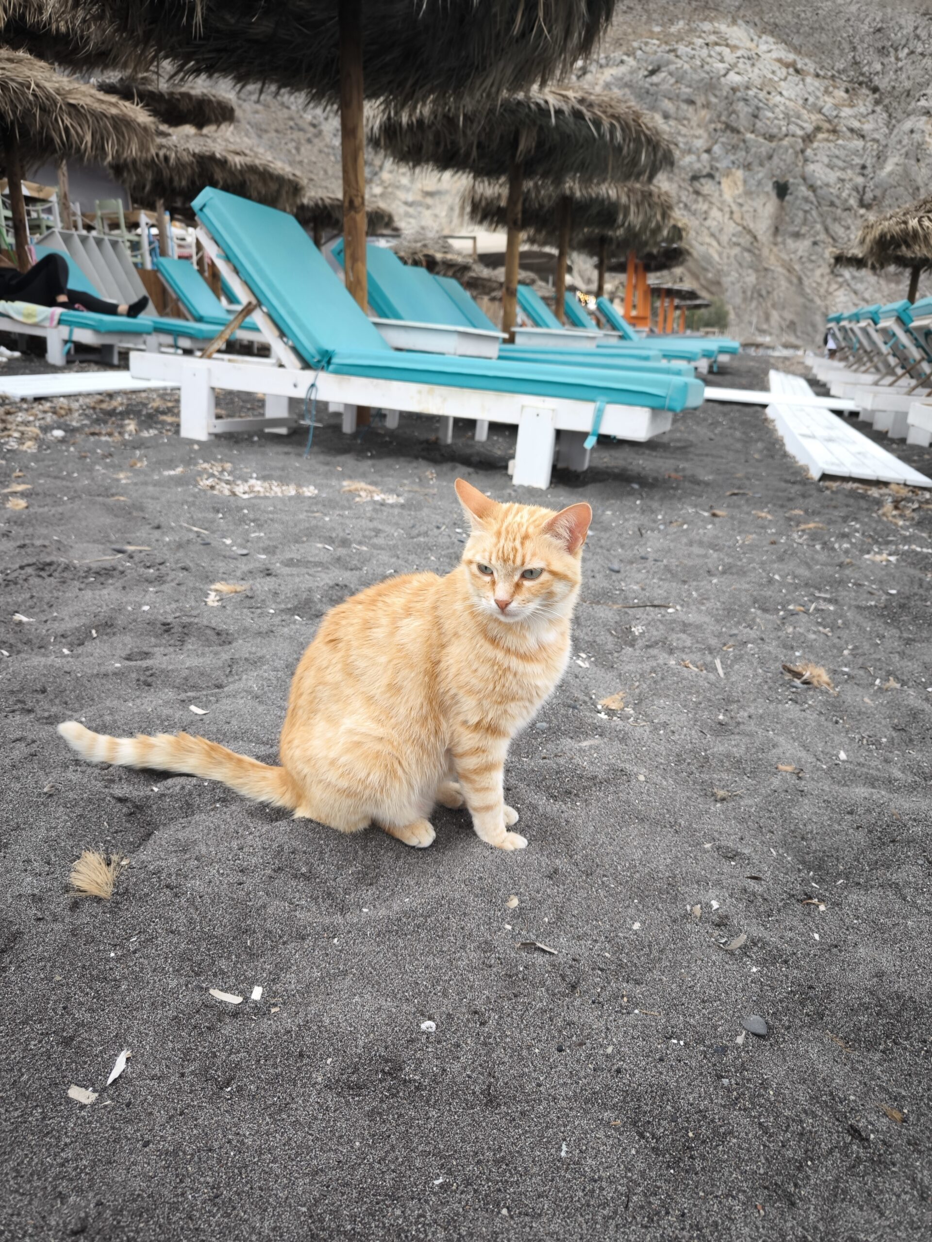 Nous avons profité de cette journée de repos pour visiter Perissa. Une longue route longe le long de la plage, où l’on trouve des restaurants, des boutiques, des activités nautiques et des chats. Un transat sur la plage coûte le prix d’une consommation, certains établissements possèdent même leur propre piscine. C’est un concept sympa quand cela n’est pas inclus dans le logement et que l’on souhaite se baigner quelques heures.